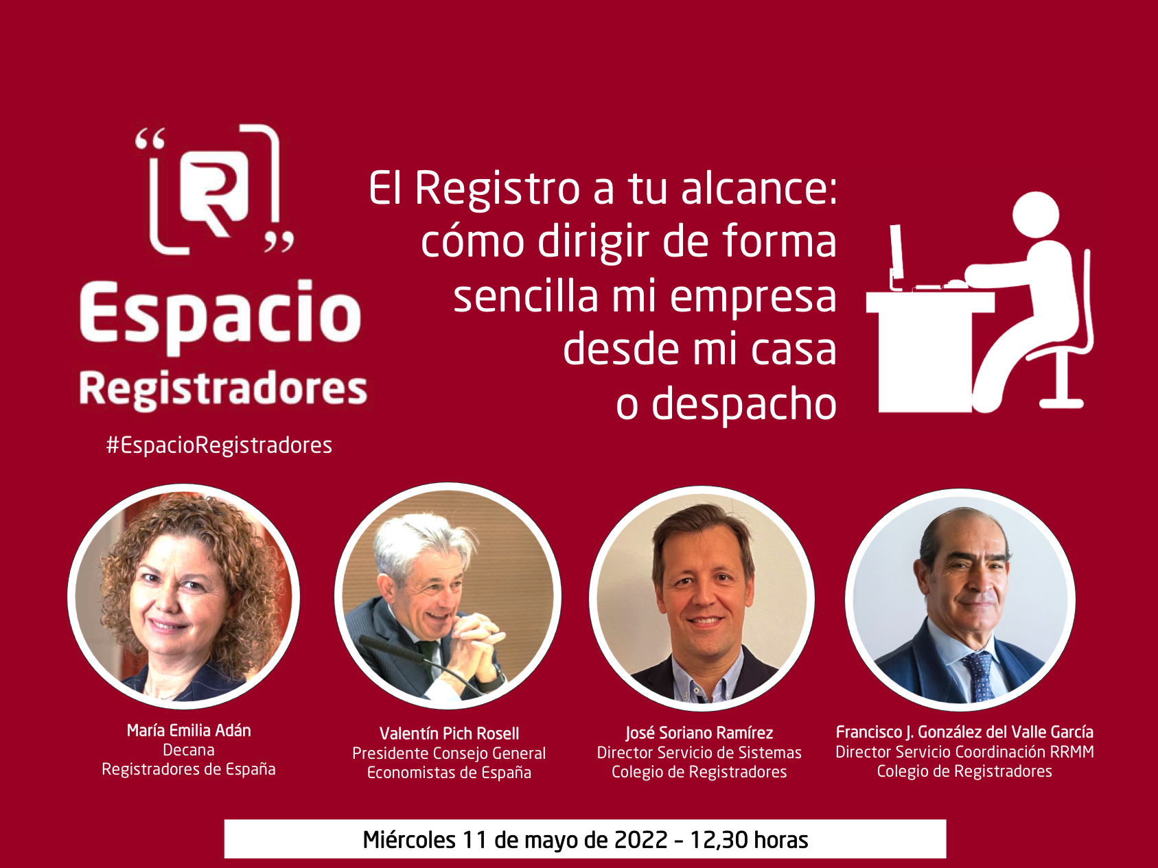 El 11 de mayo, a las 12,30, Espacio Registradores tiene una nueva JORNADA: EL REGISTRO A TU ALCANCE: CÓMO DIRIGIR DE FORMA SENCILLA MI EMPRESA DESDE MI CASA O DESPACHO.