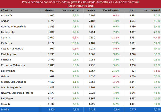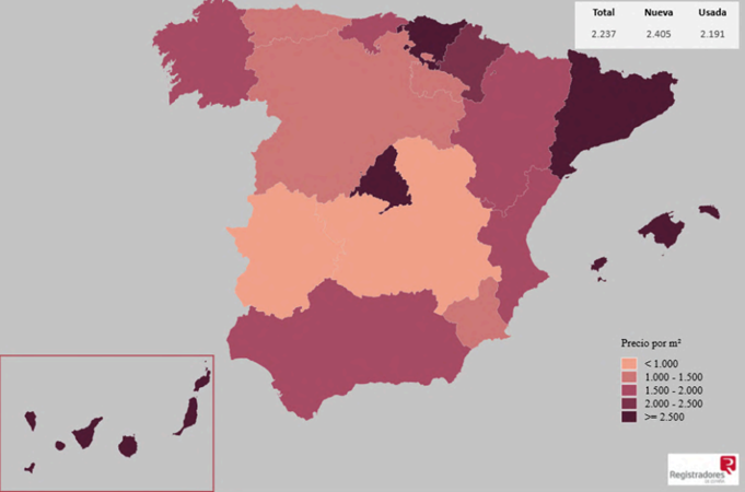 Por comunidades autónomas, los mayores precios medios se han registrado en la Comunidad de Madrid (4.112 €/m²), Illes Balears (4.096 €/m²), País Vasco (3.274 €/m²) y Cataluña (2.775 €/m²). En cuanto a las provincias, se han situado en cabeza Madrid (4.112 €/m²), Illes Balears (4.096 €/m²), Gipuzkoa (3.818 €/m²), Barcelona (3.159 €/m²) y Bizkaia (3.153 €/m²). Las capitales de provincia con mayores precios medios han sido San Sebastián (5.962 €/m²), Madrid (5.157 €/m²), Barcelona (4.719 €/m²), Palma (3.996 €/m²) y Bilbao (3.353 €/m²). Quince comunidades autónomas y cuarenta y una provincias han registrado incrementos trimestrales.