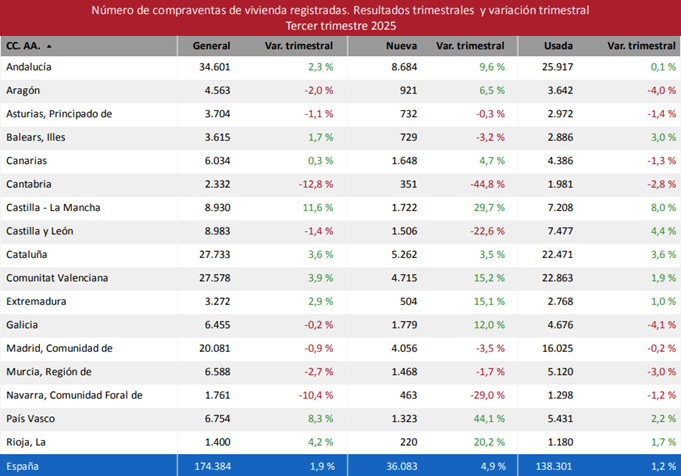 El número de compraventas de vivienda ha registrado un crecimiento trimestral del 1,9%, alcanzando las 174.384, segundo mayor resultado desde el tercer trimestre de 2007. Con respecto al tercer trimestre de 2024 el incremento interanual ha sido del 4,7%. La vivienda nueva (36.083 compraventas) ha experimentado una mejora del 4,9%. En vivienda usada se han registrado 138.301 compraventas, con un crecimiento trimestral del 1,2%. Con respecto al mismo trimestre de 2024 las compraventas de vivienda nueva se han incrementado un 10,4% y las de vivienda usada un 32,7%.