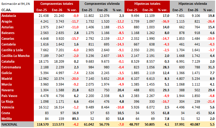 Los datos provisionales muestran que durante el mes de enero de 2026 se han registrado unas 113.600 compraventas de inmuebles, con un descenso del 4,2% respecto a enero de 2025. De ellas, en torno a 56.800 han sido compraventas de vivienda, lo que supone un descenso más acusado, del 7,0%. Se trata del mayor descenso en compraventas totales desde mayo de 2024 y en compraventas de vivienda desde junio de ese mismo año.