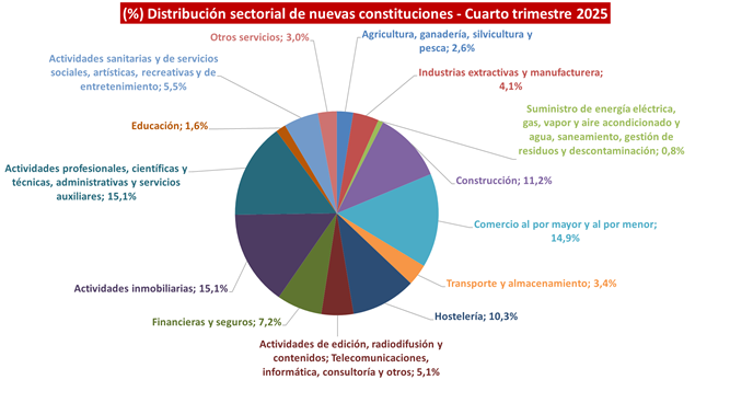 En cuanto a la distribución sectorial de los nuevos proyectos empresariales iniciados durante el cuarto trimestre del pasado año (conforme a la CNAE-2025, en vigor desde enero), muestra la habitual estabilidad respecto a periodos anteriores. Por su importancia, la construcción y las actividades inmobiliarias suponen conjuntamente más de una cuarta parte de las nuevas empresas creadas, el 26,3%, mientras que un 14,9% pertenecen al sector del comercio, y un 10,3% a la hostelería.