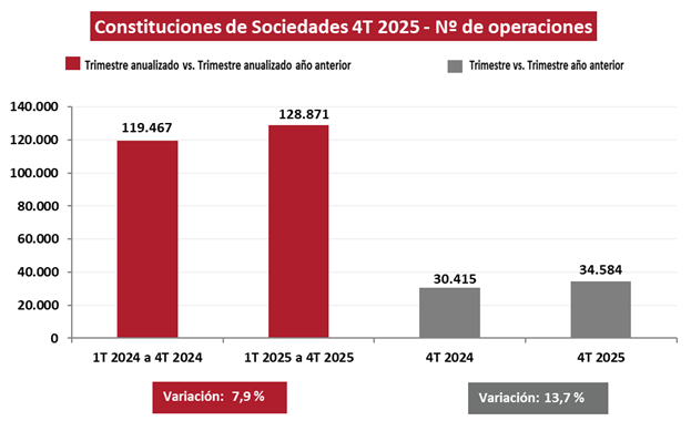 Las constituciones de sociedades aumentan un 13,7% en el último trimestre de 2025
